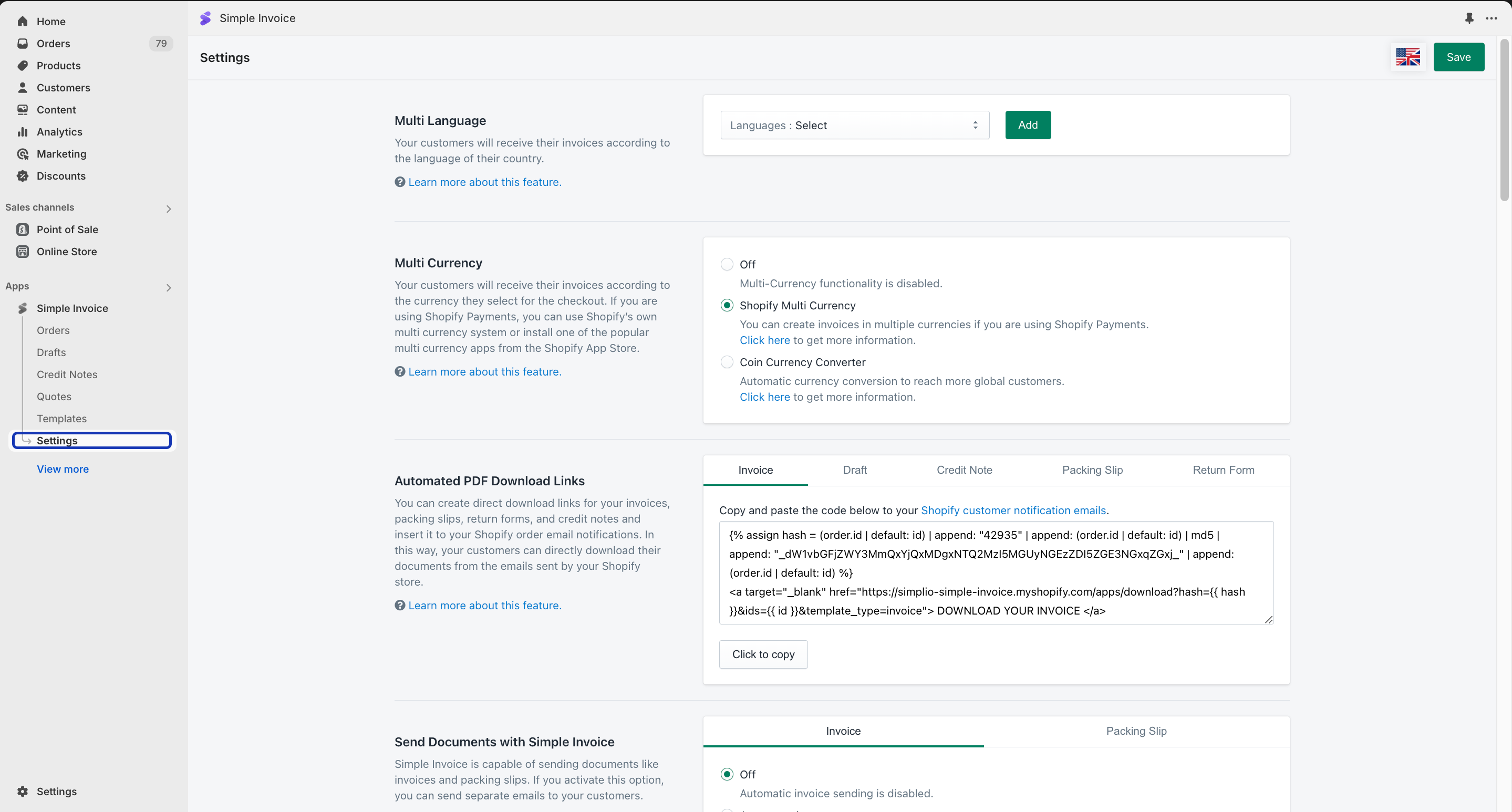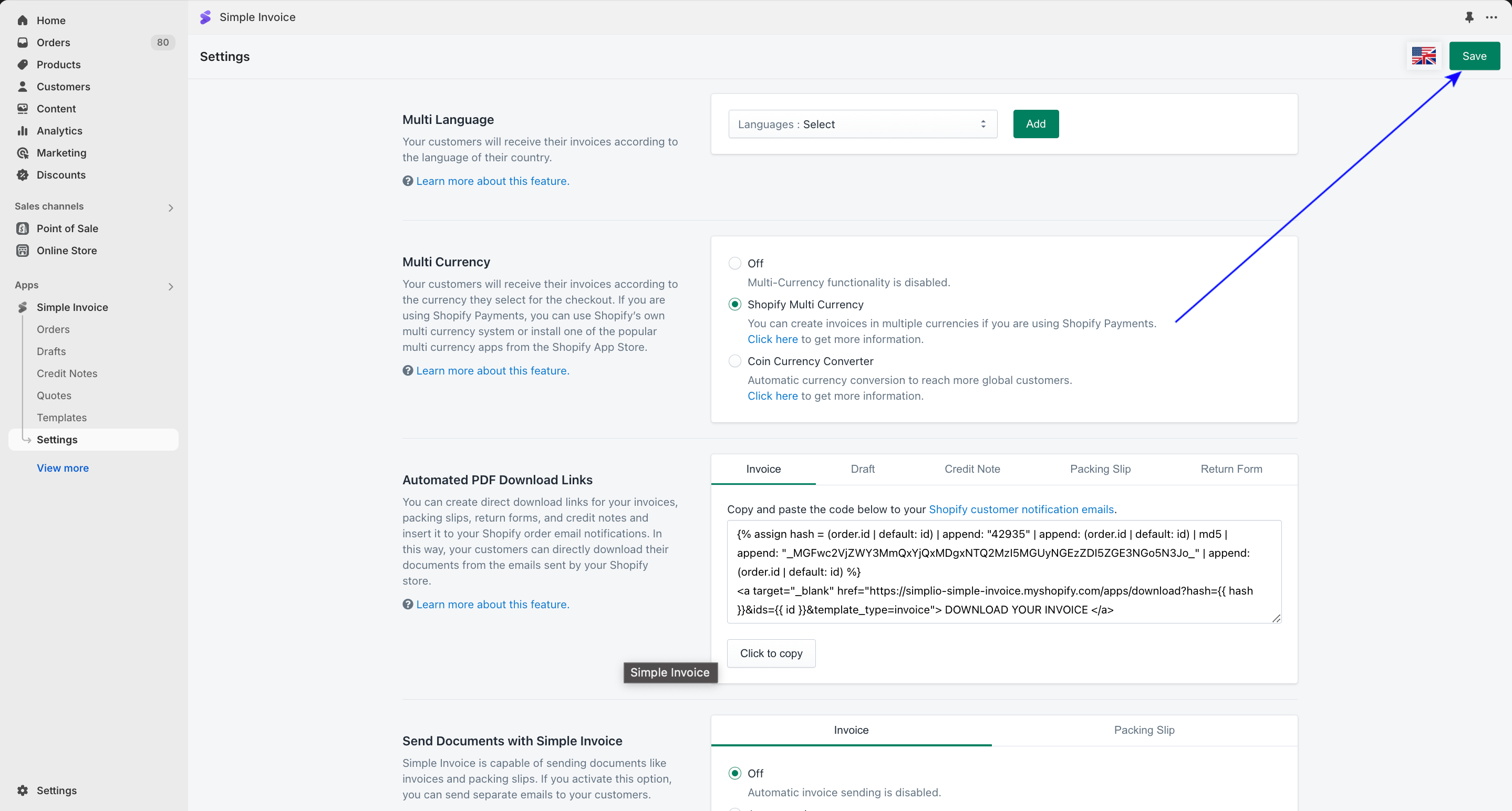 Simple Invoice supports Shopify's multi-currency conversion functionality which you can configure by following the simple steps below: