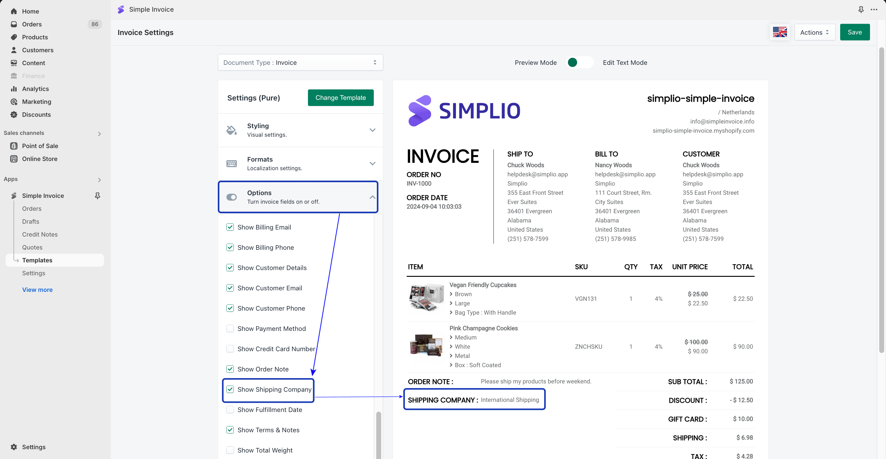 Step 3: Click on the ‘Options’ section, and click on the ‘Show Shipping Company’ under the ‘Order Details’.