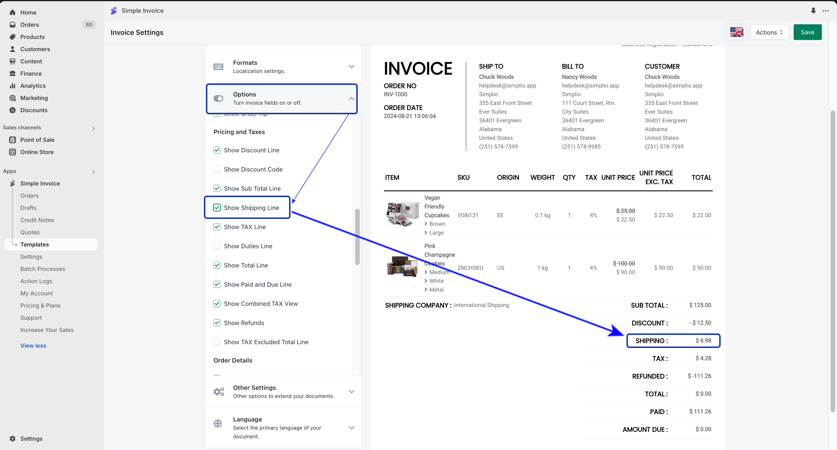 Step 3: Click on the ‘Options’ section, scroll down, and click on the ‘Show Shipping Line’ option under ‘Pricing and Taxes’.