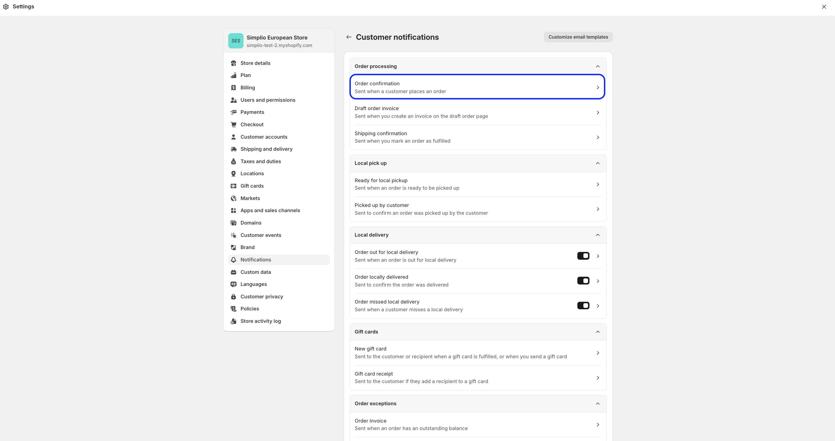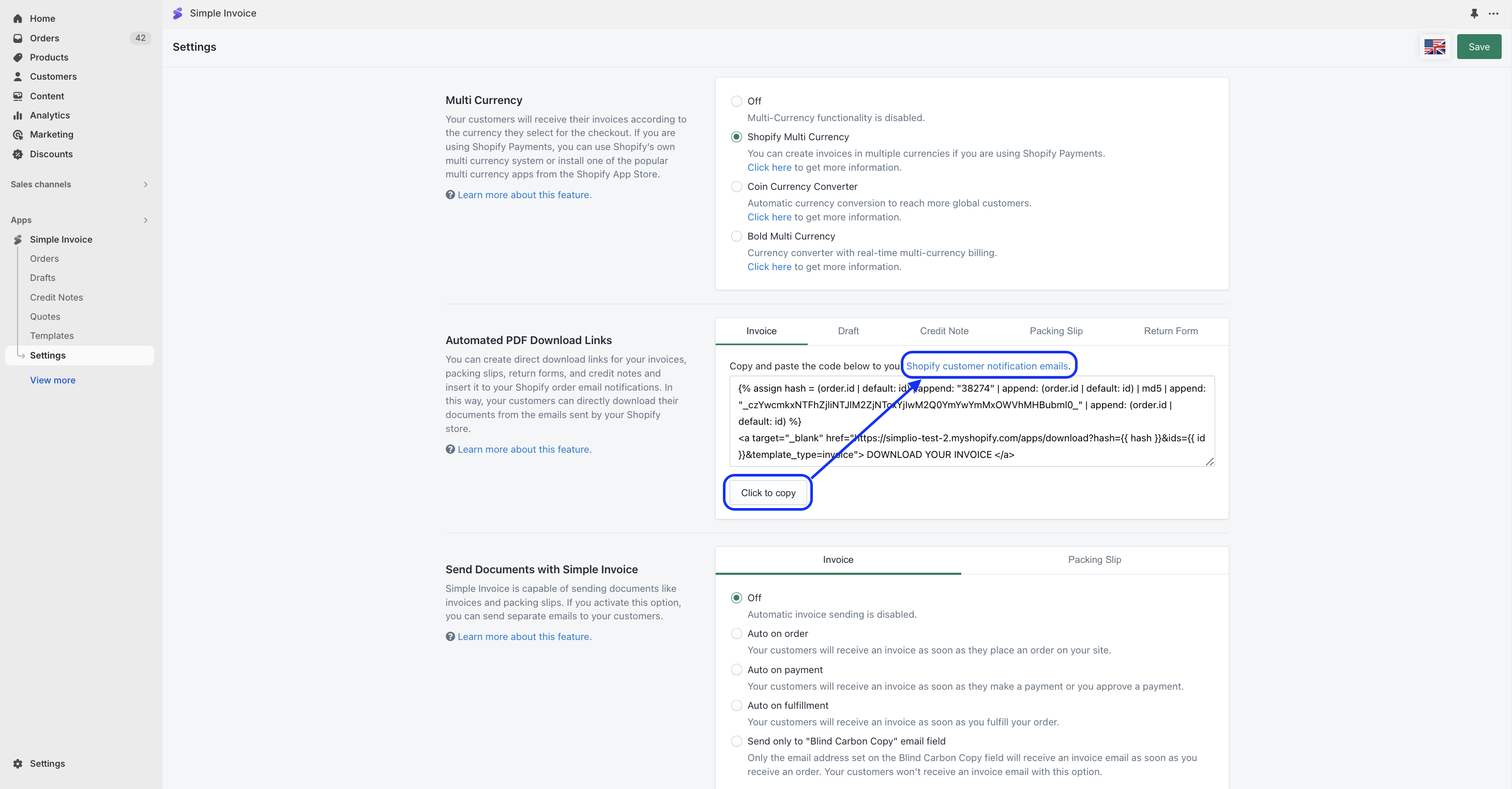 Step 3: Scroll down to the “Automated PDF Download Links” section. Next, select the desired document type. Click on the ‘Click to copy’ button, and then click on the ‘Shopify customer notification emails’ link to be redirected to the Shopify ‘Notifications’ page.