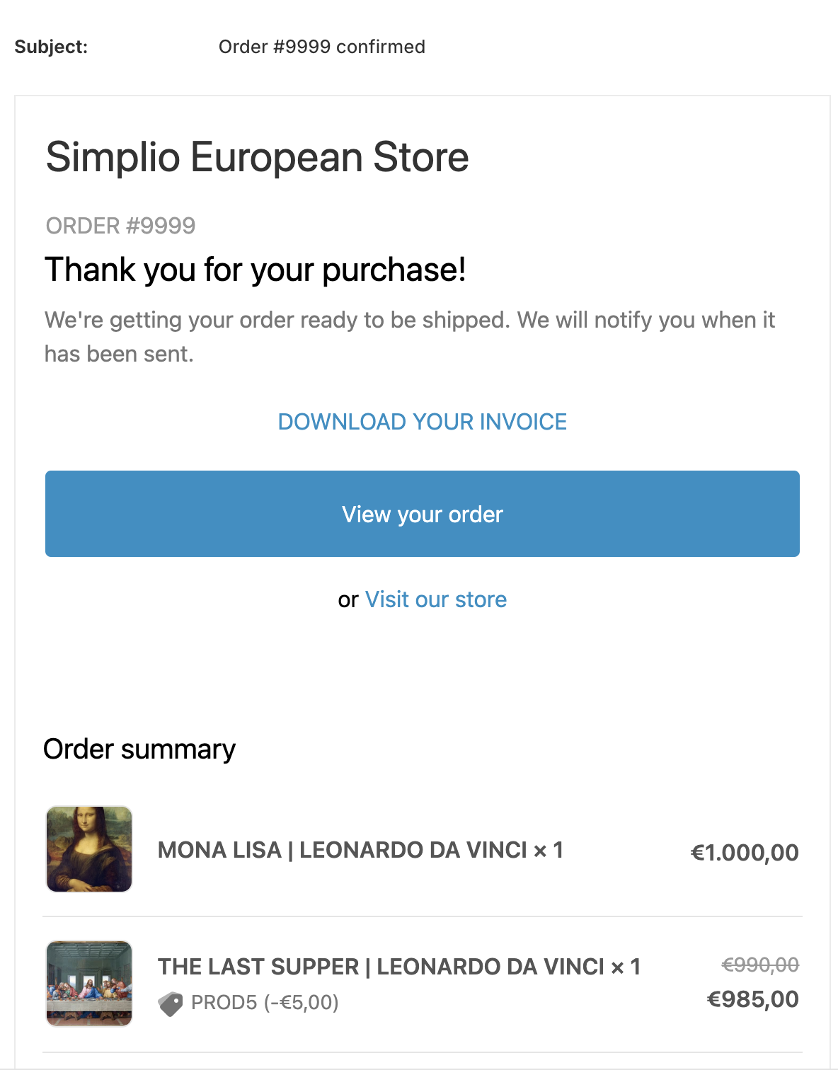 After adding the PDF Download Link Code, you can preview the order confirmation page as shown below.