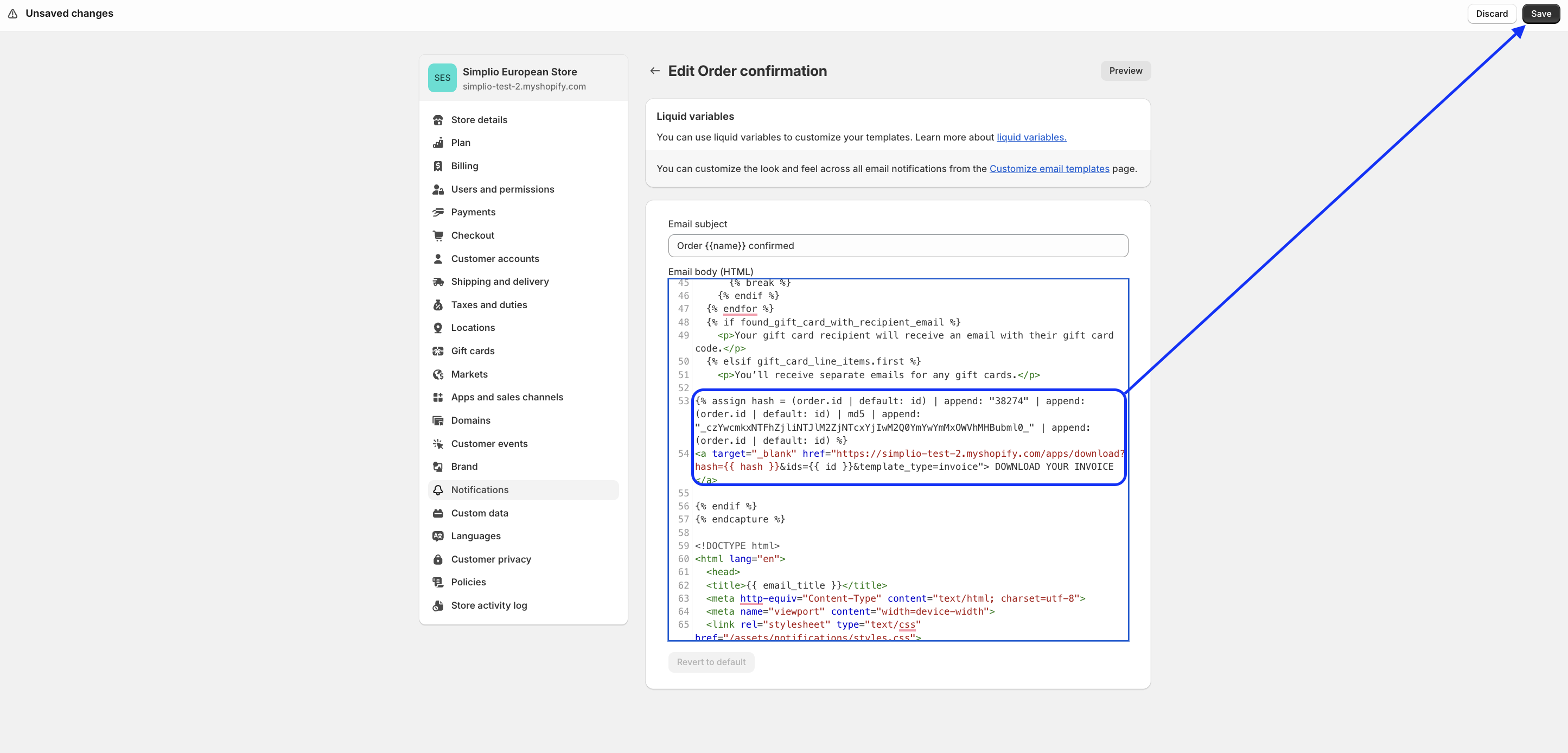 You can insert a download link to the "Shopify Order Notification Email" by following the simple steps below: