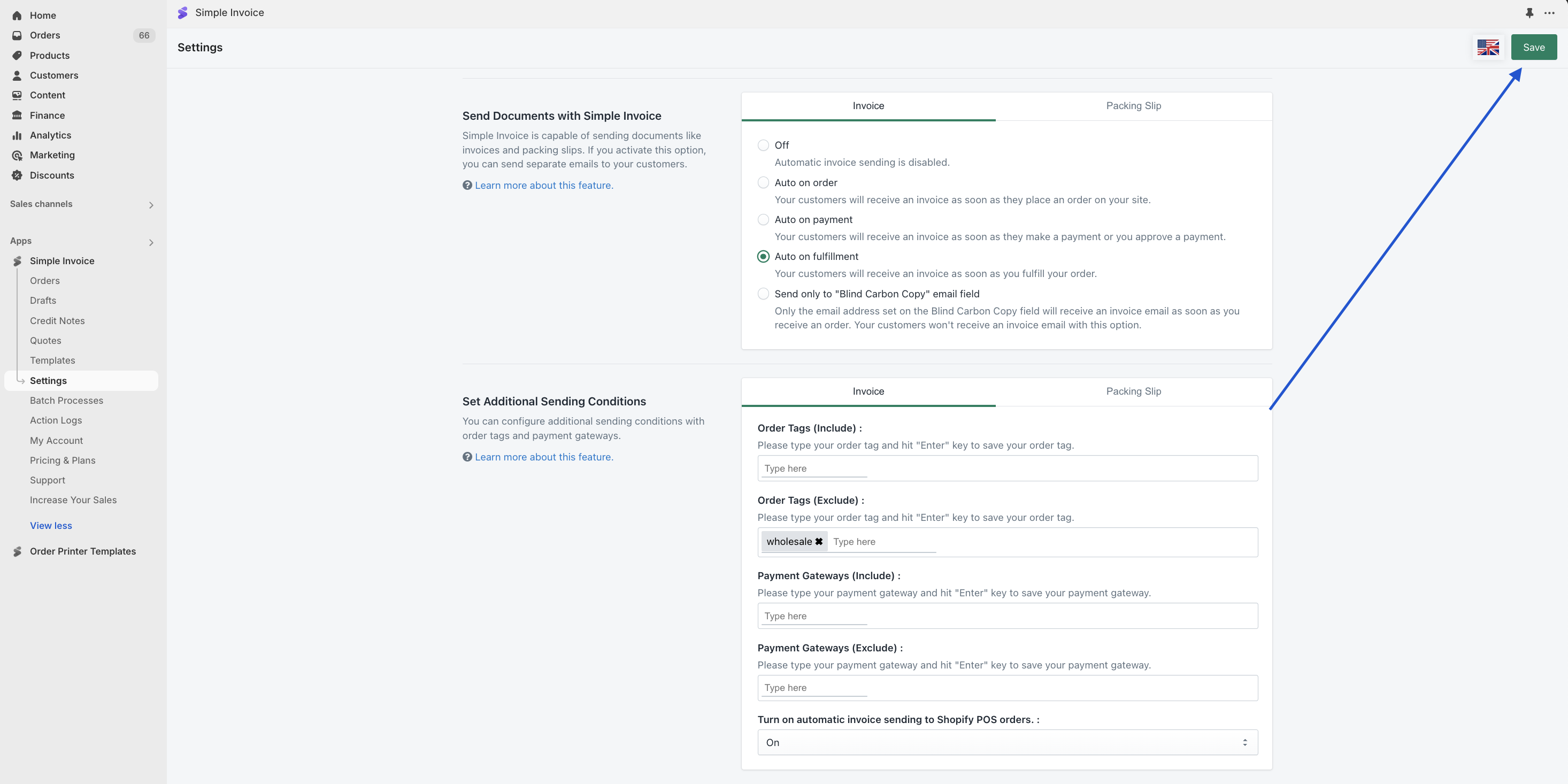 If you set ‘Send Invoices with Simple Invoice’ option to “Auto on order“, even if you add a tag into this field, invoices will still be sent to all of your customers. In order for this condition to work, ‘Send Invoices with Simple Invoice’ option must be set to “Auto on payment” or “Auto on fulfillment“.