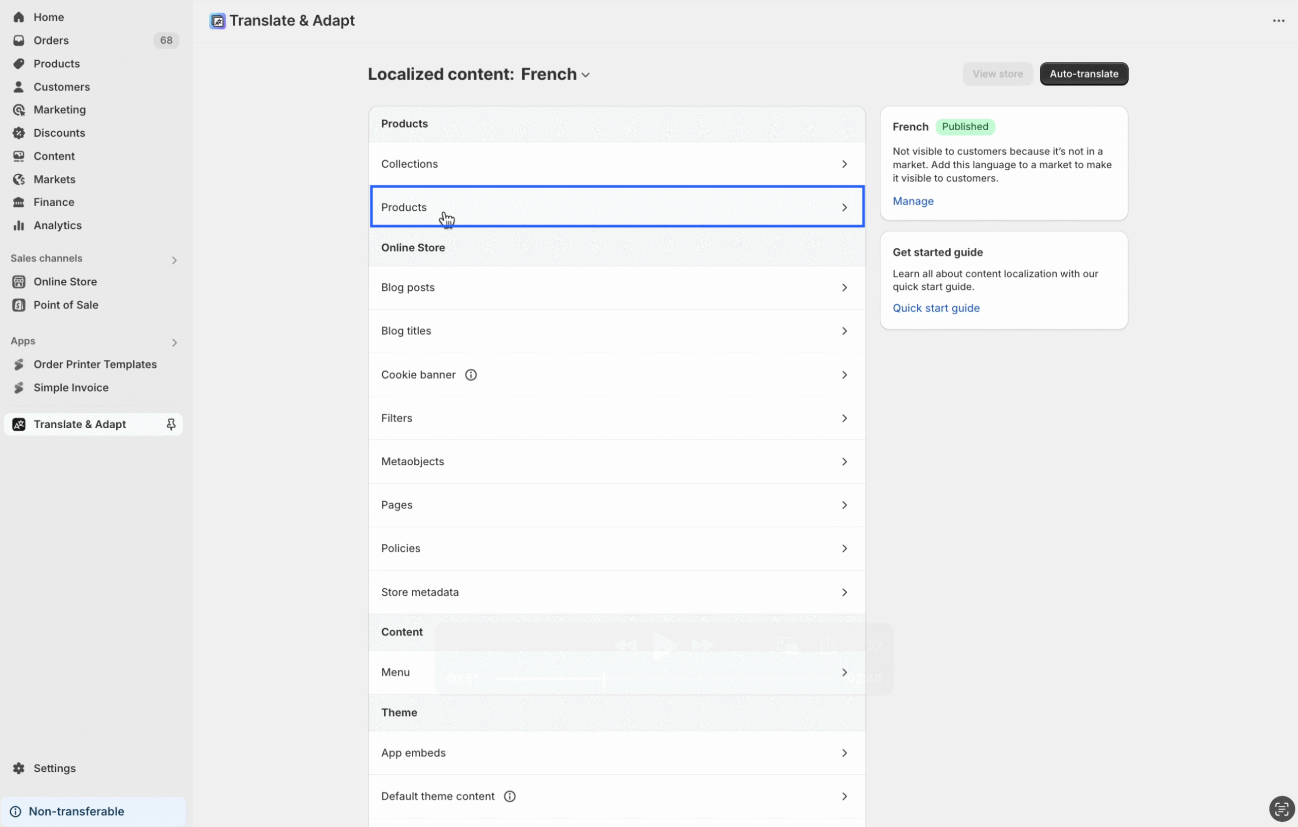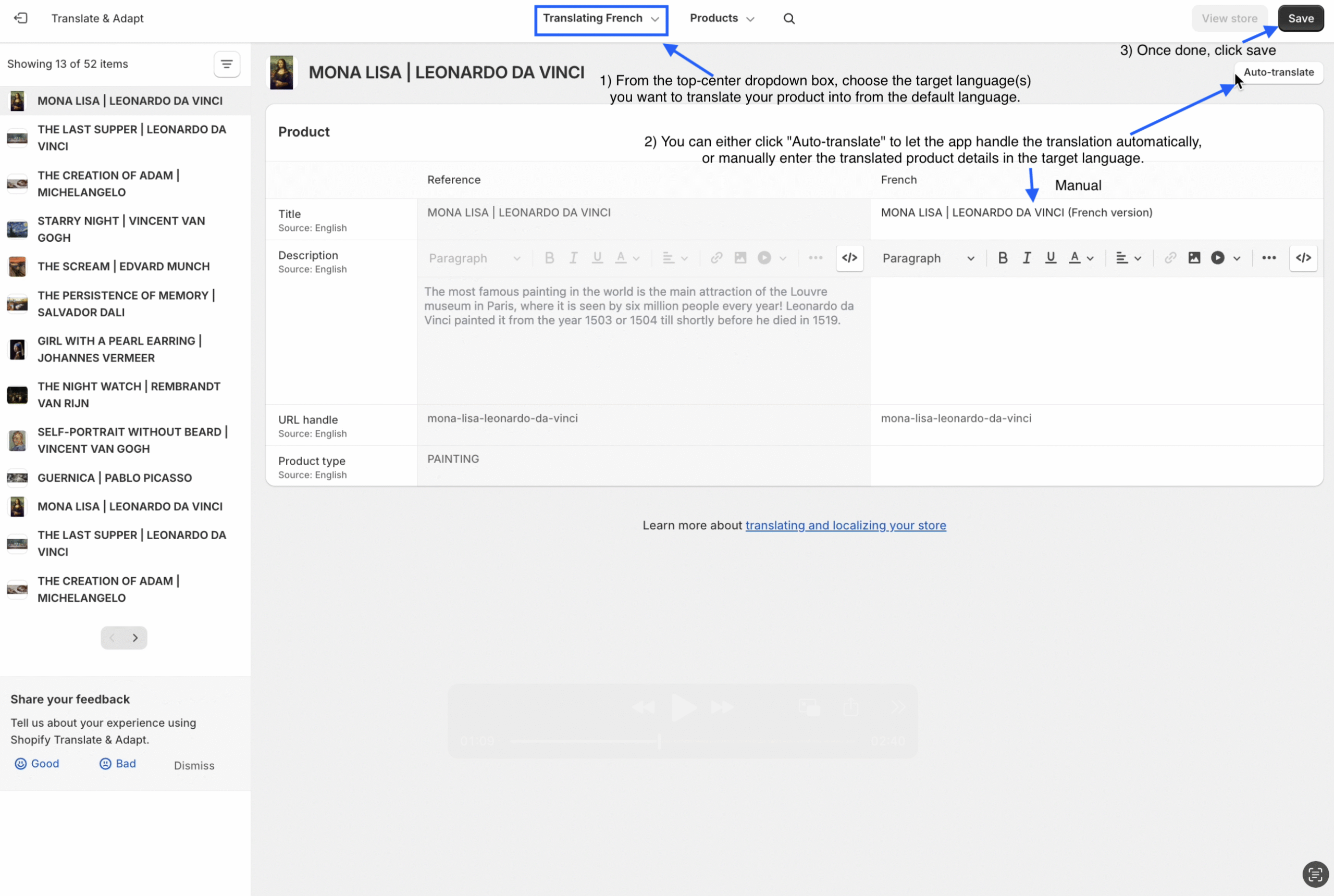 Step 8: From the top-center dropdown box, choose the target language(s) you want to translate your product into from the default language. You can either click “Auto-translate” to let the app handle the translation automatically, or manually enter the translated product details in the target language. Once done, click “Save.”