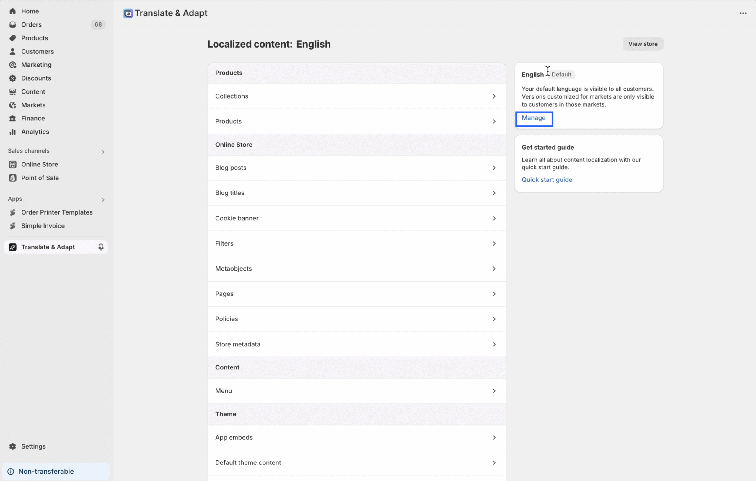 Step 3: In the Translate & Adapt app, click on the Manage option.
