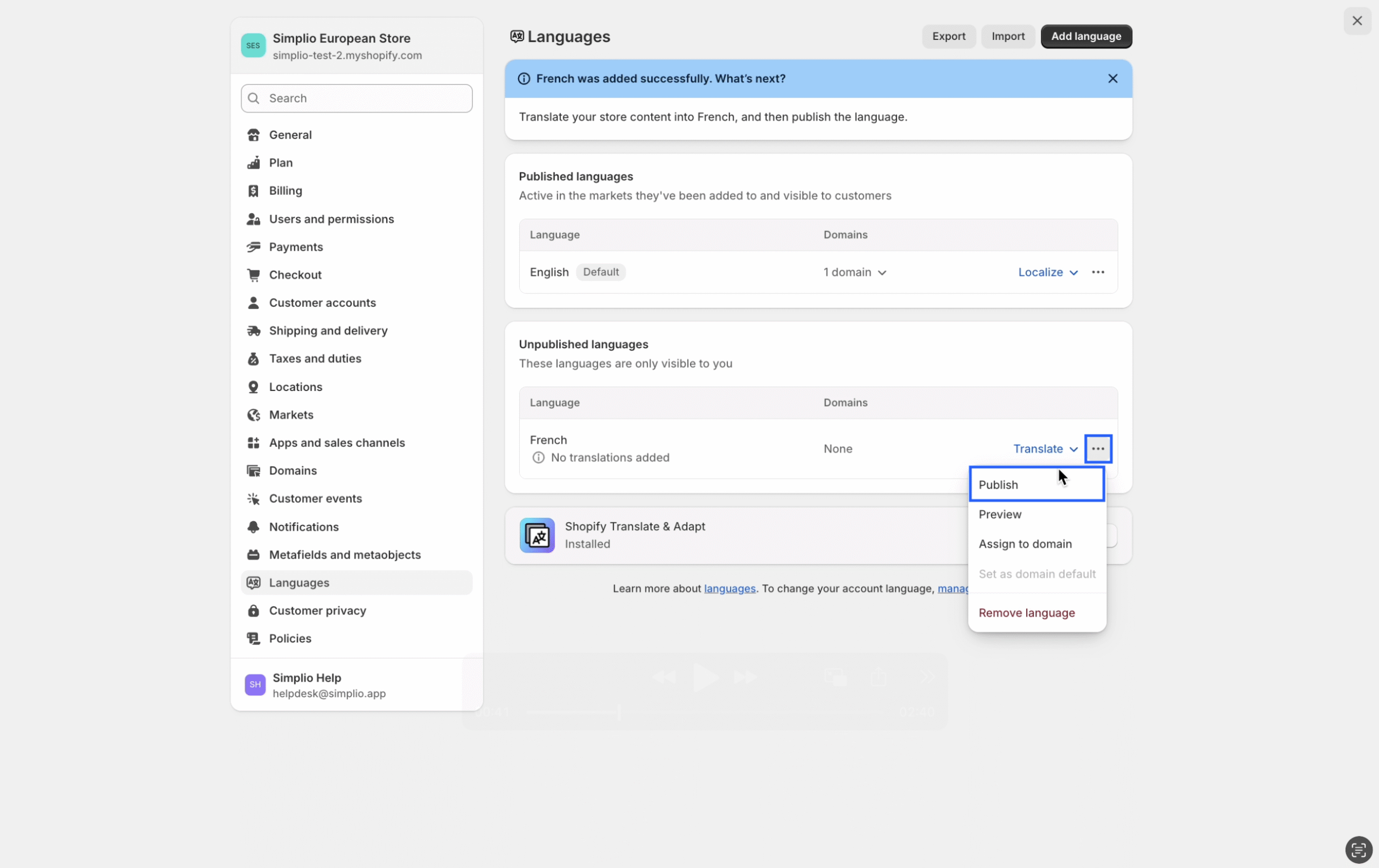 Step 5: After adding the language(s), under “Unpublished Languages,” click the three dots next to the language(s) and select Publish.