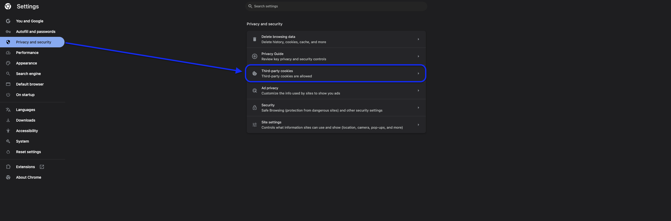 - In the “Privacy and Security” page, click on “Third-party cookies”.