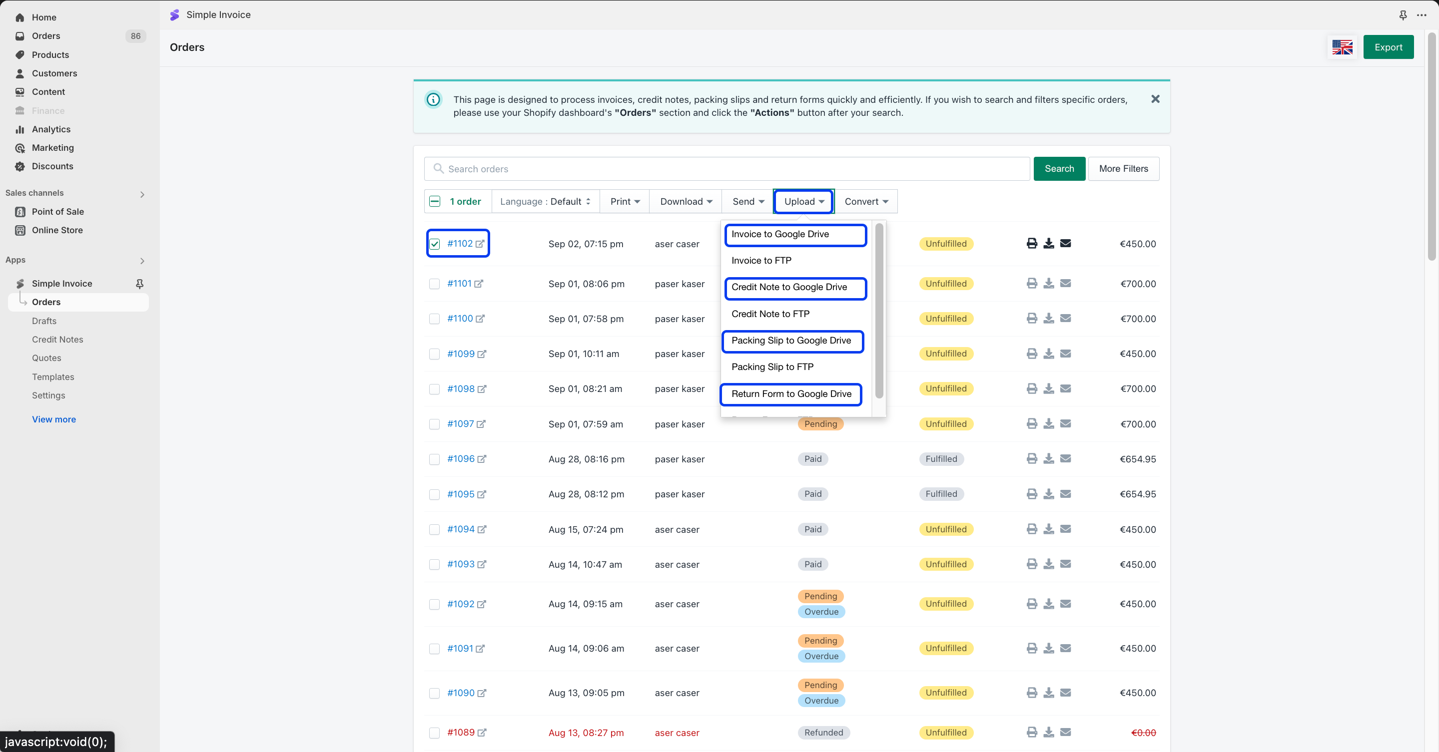 To do so, select the orders you wish to upload, click the ‘Upload’ button, then select the “Invoice to Google Drive” option.
