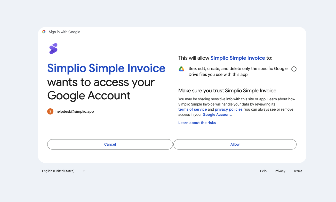Step 4: Please grant Simple Invoice permission to access your Google Drive account through the Google login screen.