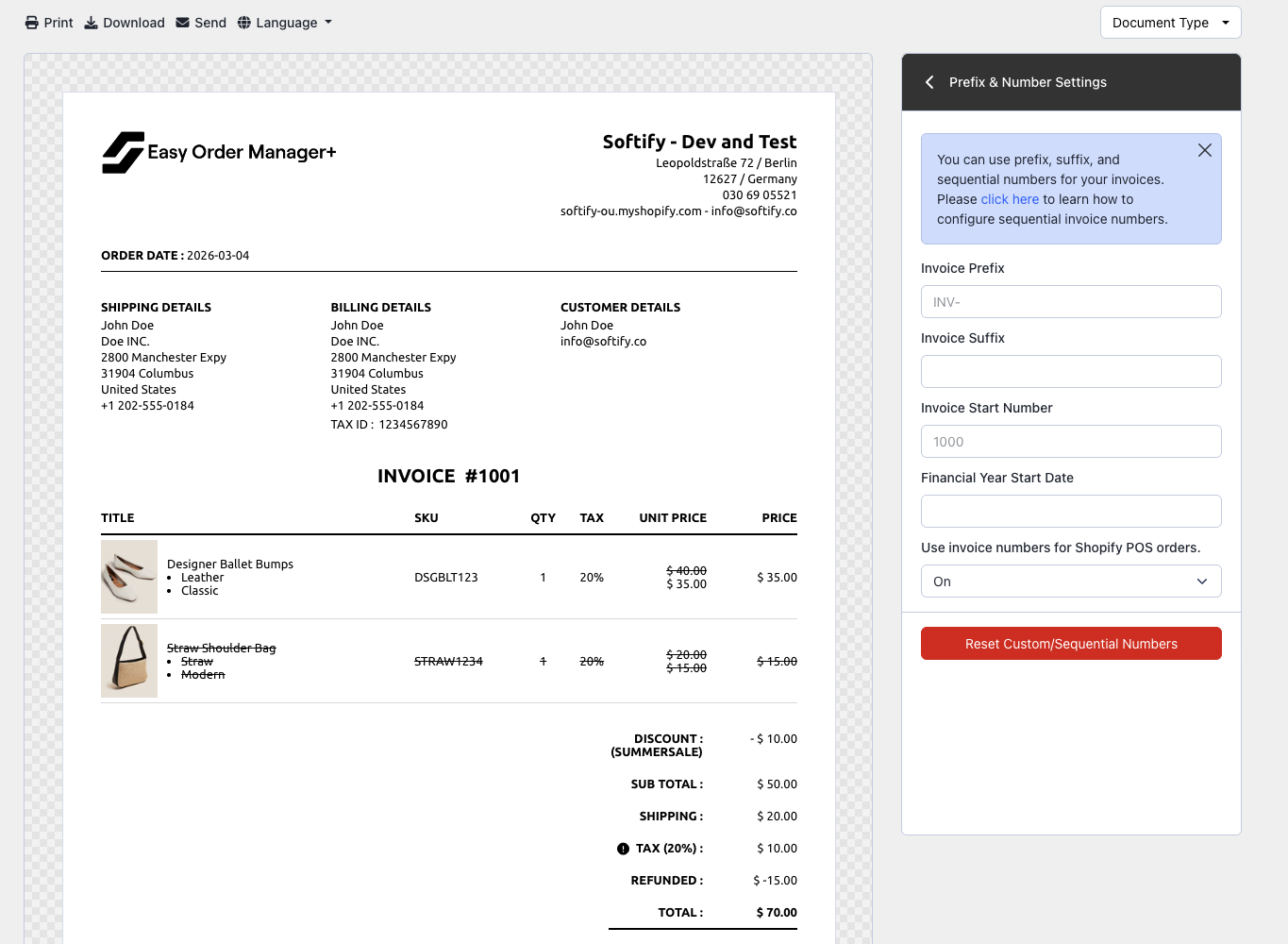 • Multi-country Support: If you sell to multiple countries, Easy Order Manager+ supports country-specific sequential numbering.