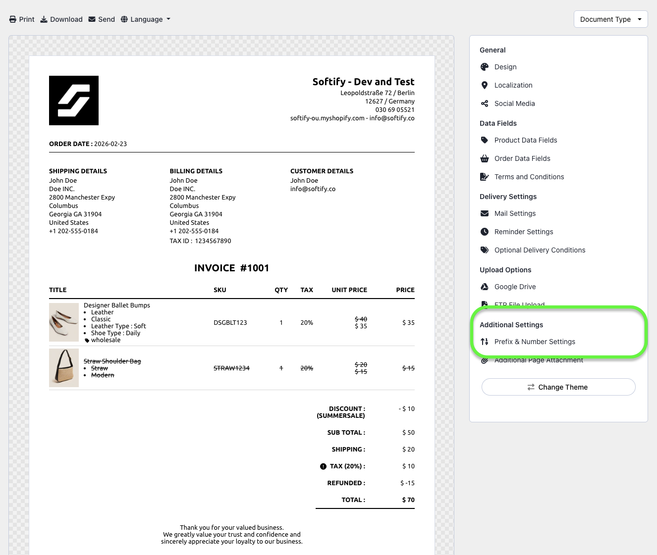 • Invoice Suffix: Add any text or numbers you want to appear after the invoice number.