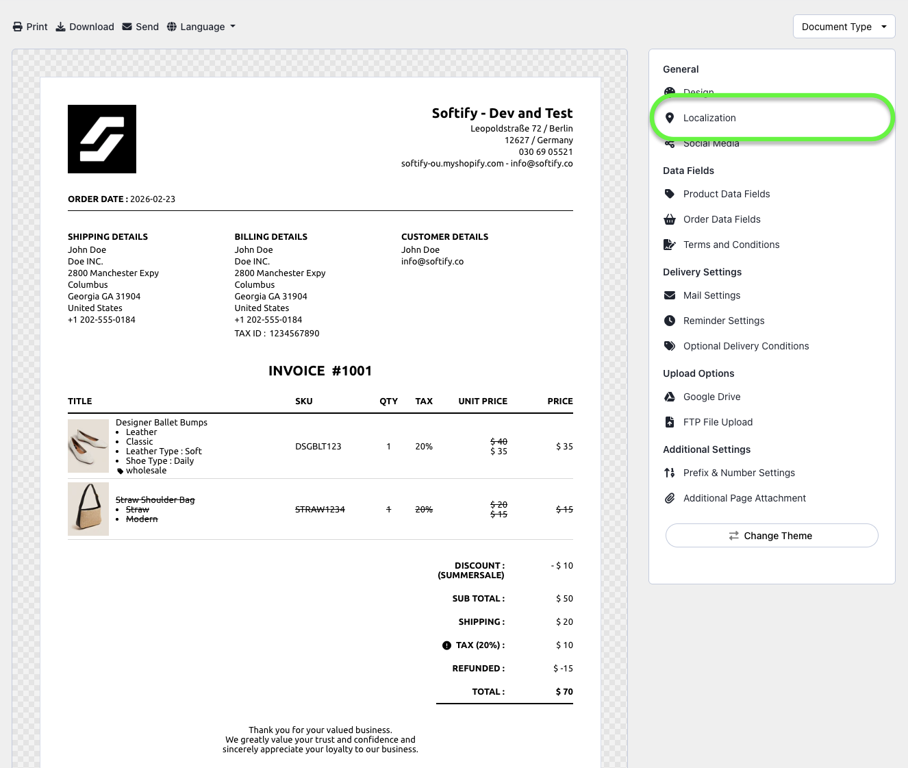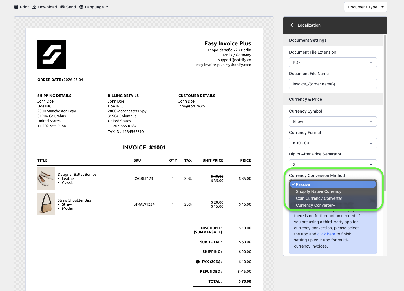 Because of this architecture, Easy Order Manager+ does not perform currency conversions or modify order data. The app converts the latest order data received from Shopify into invoices exactly as provided.
