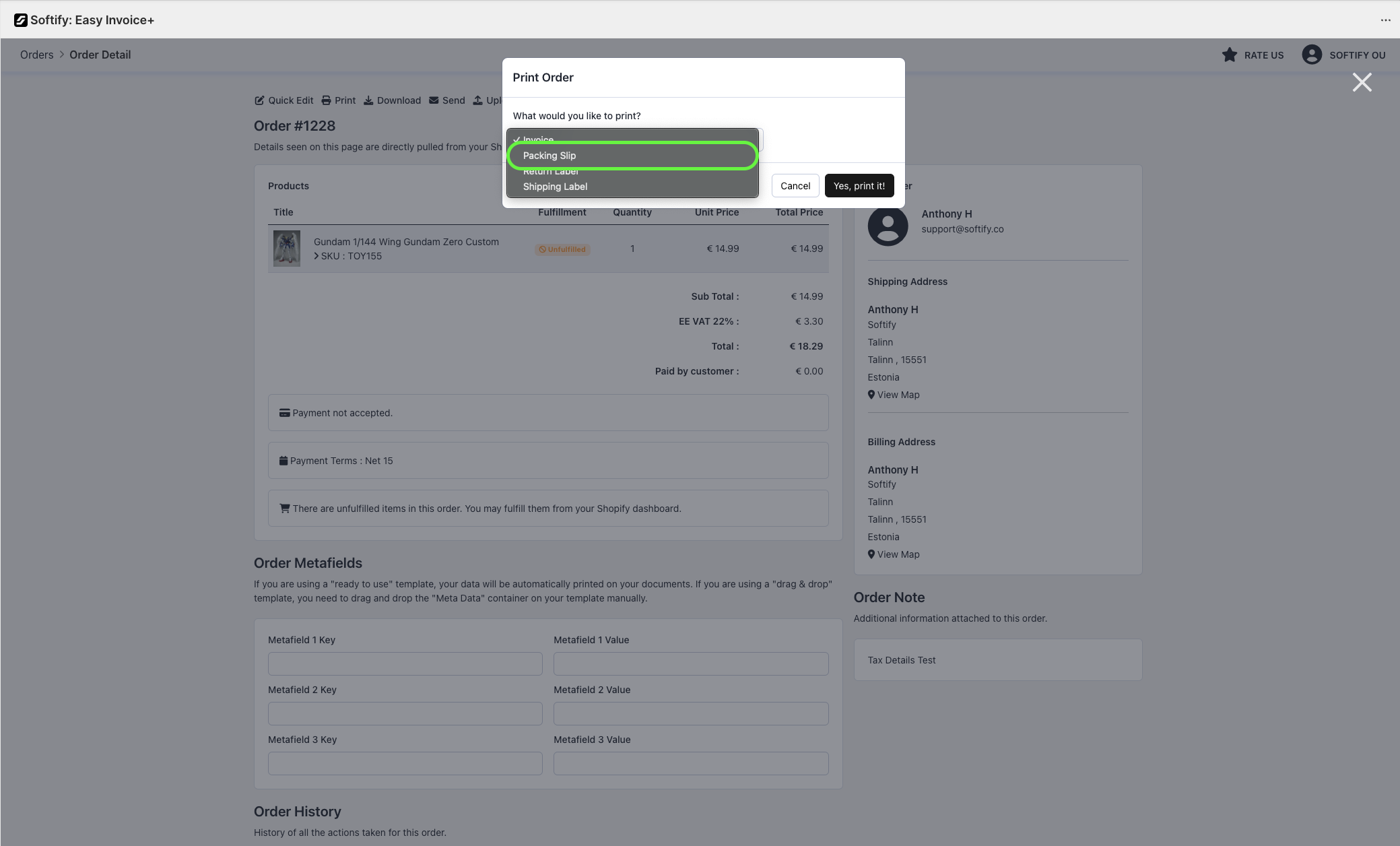 Alternate Method: You can also create a packing slip directly from the Order Details page in Easy Order Manager+. Simply click on the desired order, select the Print or Download option, and choose Packing Slip from the dropdown menu.