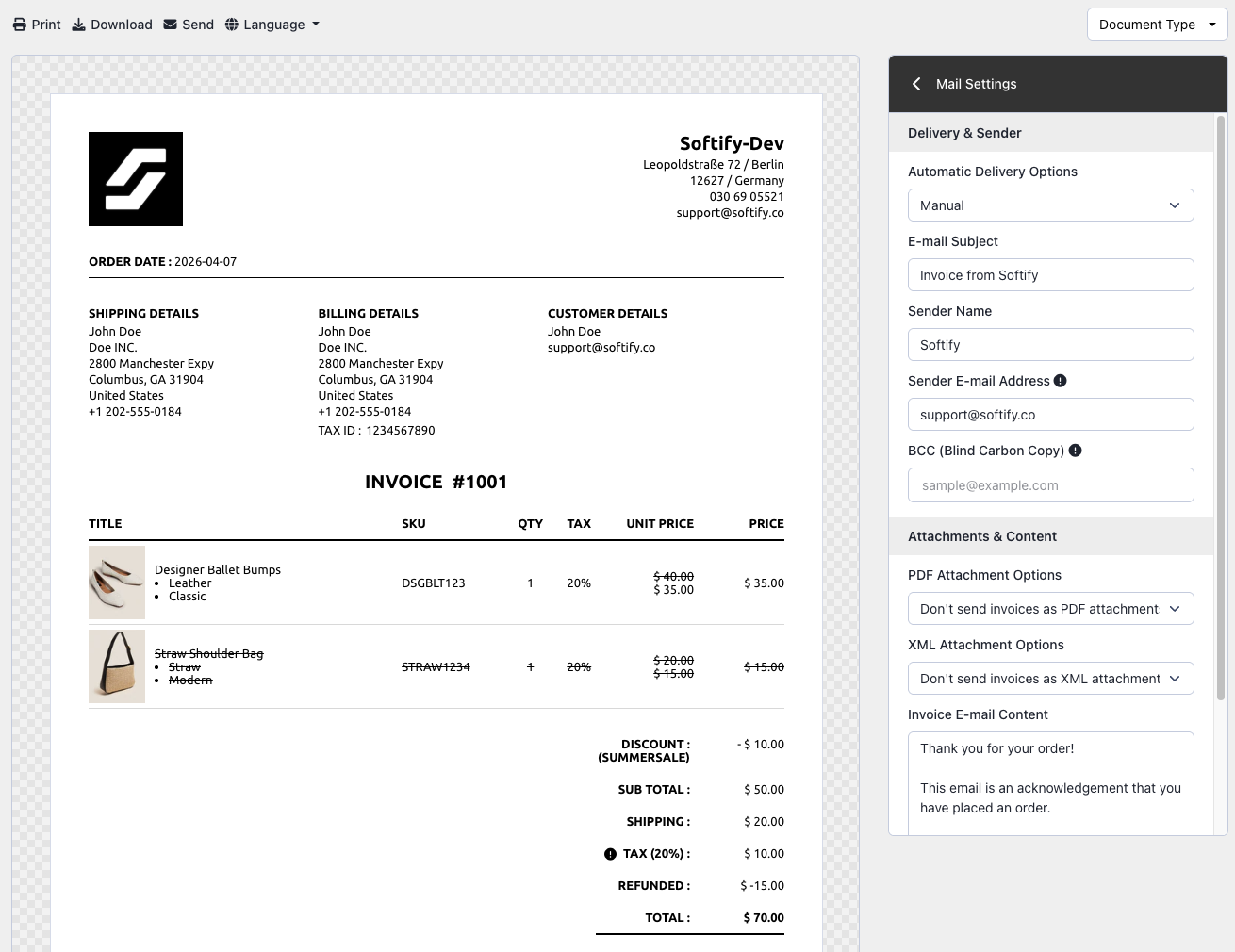 - Attachment Options: Choose whether to include the invoice as a PDF attachment.