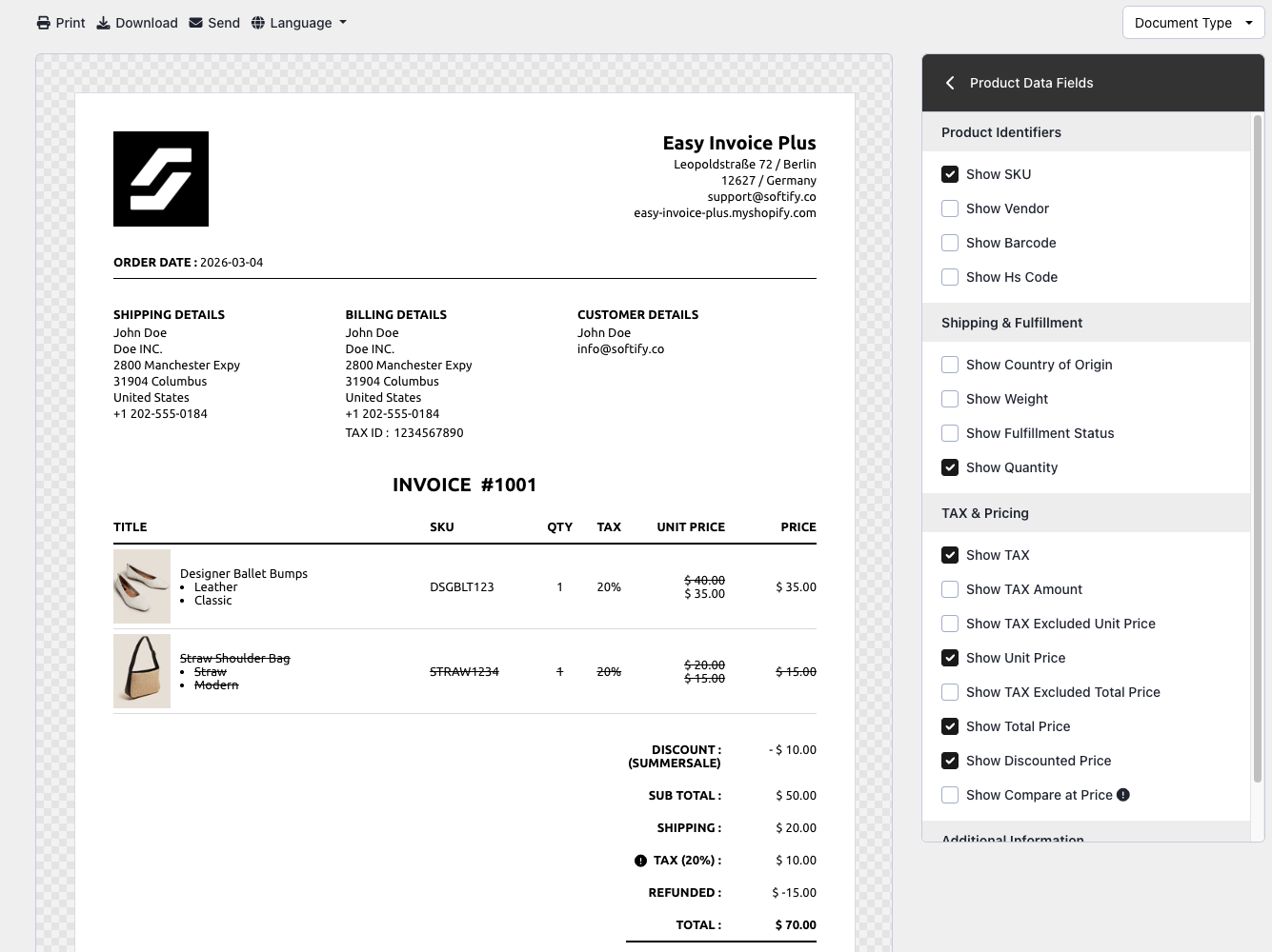 This guide provides all the essential information for customizing which product data fields are displayed on your invoices.