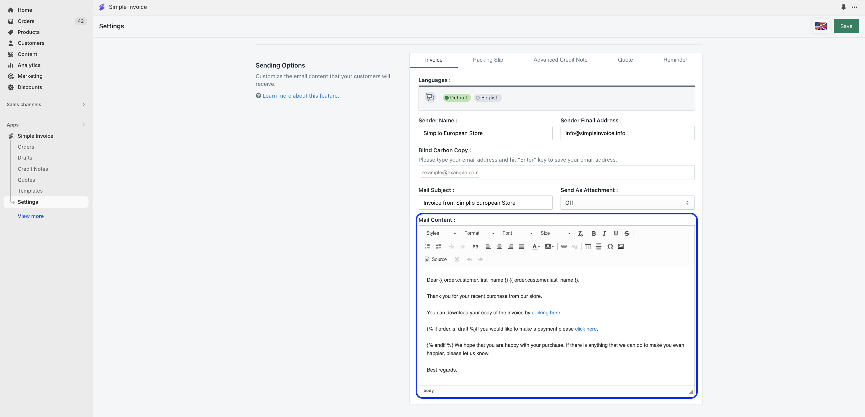 You can use predefined variables in the invoice email content.